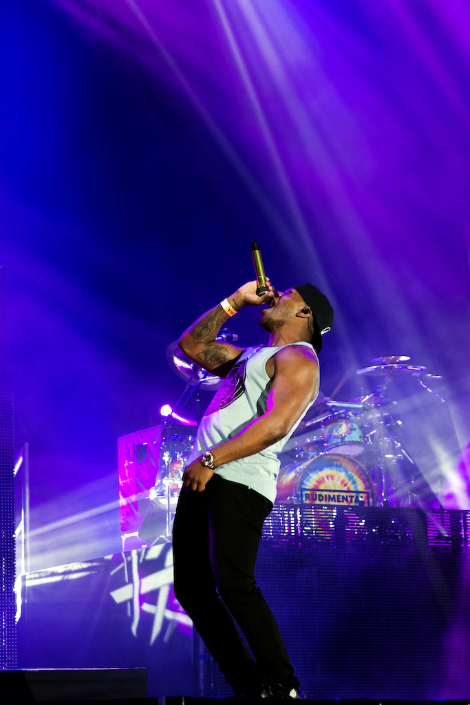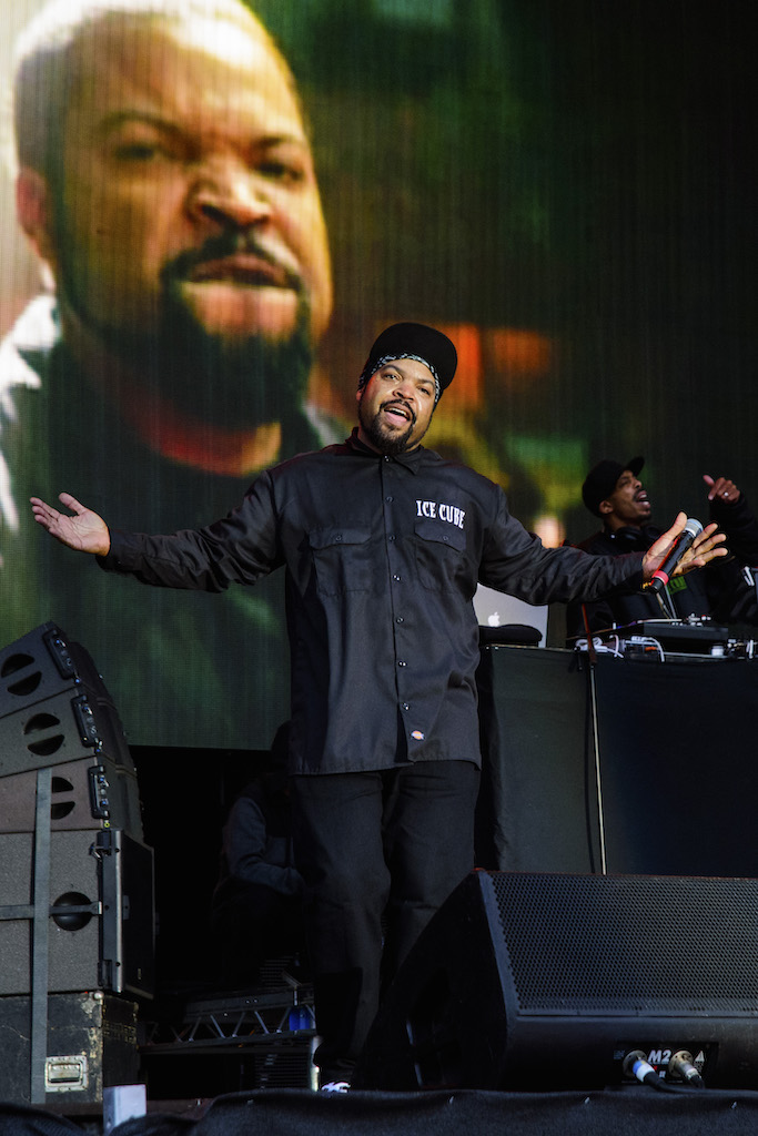 A rare candid break in Ice Cube's on stage gangster persona when he smiles at the crowd going wild and says "Thank you!"