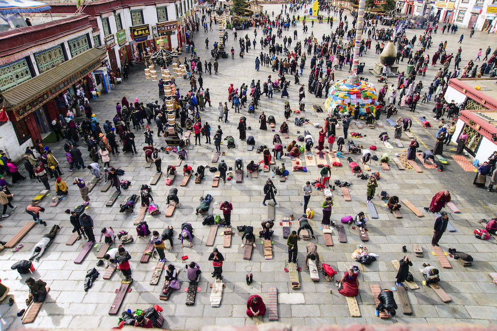 A Tibetan man and his Chinese grandson take a break from performing a kora (the Buddhist ritual of cirmnavigating a sacred site).