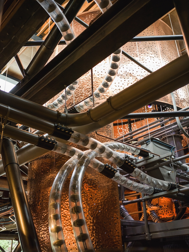The way these transparent tubes shuttle coffee between copper vats during roasting process and directly to the coffee machines at the Starbucks Reserve is mesmerising.