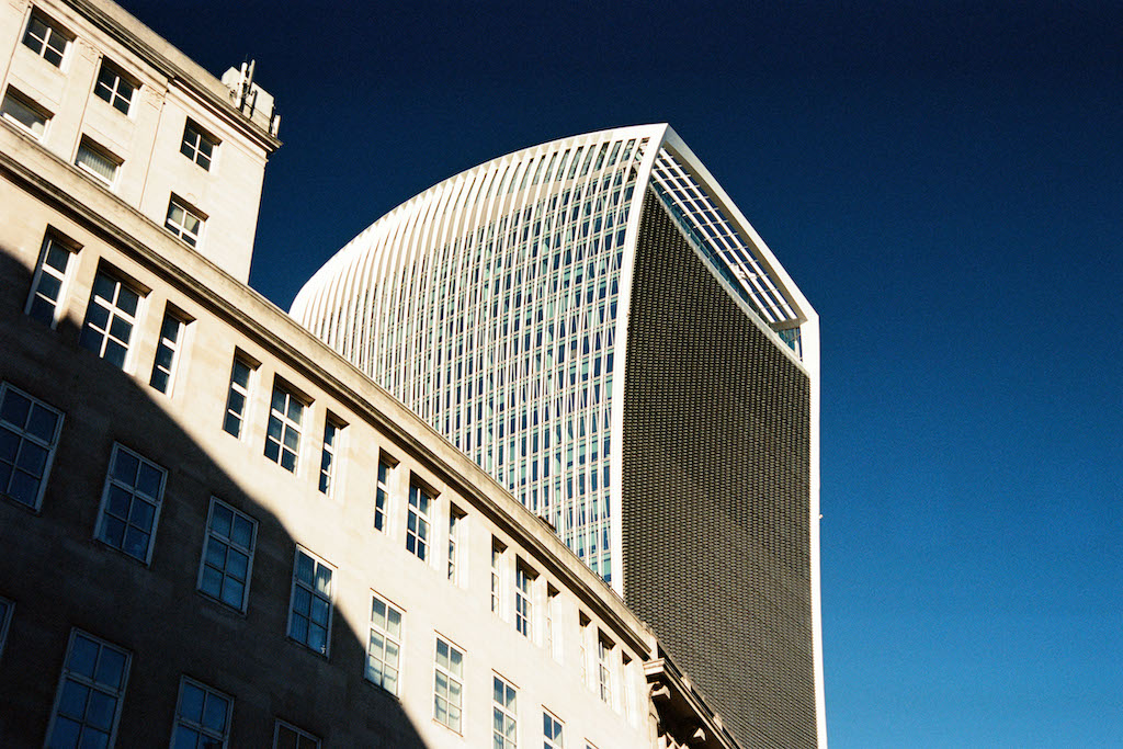 20 Fenchurch Street in the City of London, affectionately known as "The Walkie Talkie Building" due to it's usual shape. Designed by the Uruguayan architect Rafael Viñoly.